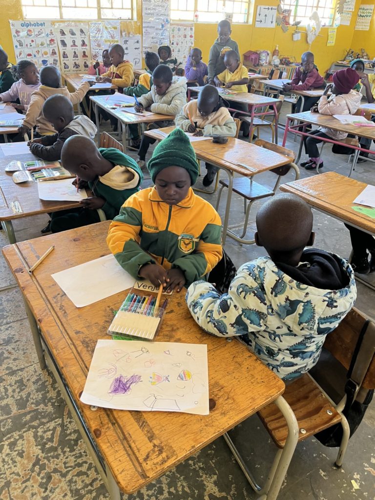 Auch hier waren wir jederzeit willkommen und wir genossen es mit den Kindern im Kindergarten zu tanzen, zu spielen oder zu singen und in den Phasen des Lernens zu unterstützen. Zeitweise durften wir eine der beiden Gruppen auch eigenständig betreuen und unterrichten. Wir übten mit ihnen beispielsweise Formen, Zahlen oder Farben. In den Wochen, in denen die Wasserversorgung des Hope Spots nicht gegeben war, war es auch eine unserer Aufgaben, die Kindergartenkinder hinaus in „den Busch“ zu begleiten, um dort auf Toilette zu gehen. In den Pausen bemerkten wir zudem, dass die Kinder und die Betreuerinnen sehr viel Wert darauf legen und Freude daran haben, ihr mitgebrachtes Essen zu teilen, unter anderem, da einige keines dabeihaben und auf die Brotzeit der anderen angewiesen sind.