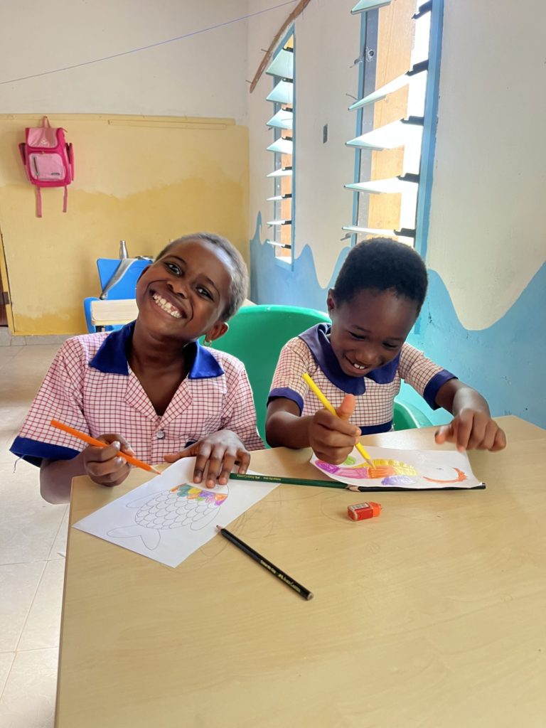 Am ersten Schultag dachte ich, ich würde zunächst das ghanaische Schulsystem beobachten. Doch kaum angekommen, hielt mir die Lehrkraft der zweiten Klasse ein Buch hin: „Can you teach this?“ und schon ging es los. Ich war völlig überwältigt: Wie läuft der Unterricht? Welche Regeln gelten? Was können die Kinder schon? Was ich zu diesem Zeitpunkt noch nicht wusste, dass ich mit dieser Klasse in den kommenden zwei Monaten viel Zeit verbringen werde. Denn nach drei Wochen übernahmen Anna und ich schließlich die Zweitklassenleitung. Uns war direkt bewusst, dass es zwar herausfordernd sein wird, aber wir auch viel Freude und Motivation mitbrachten, uns dieser besonderen Aufgabe zu stellen.