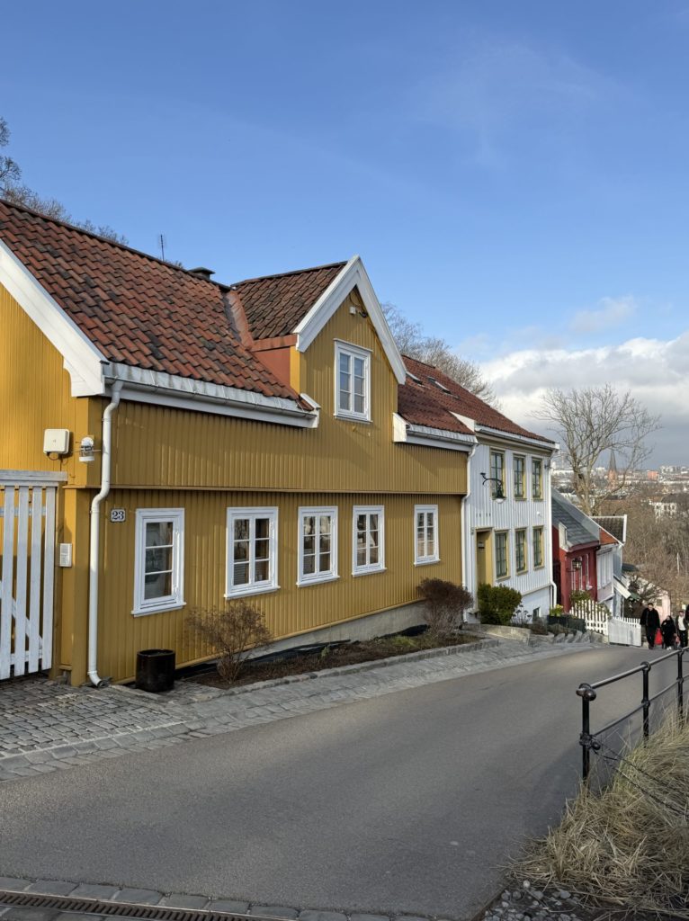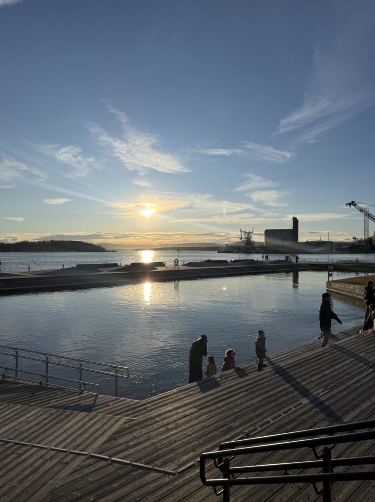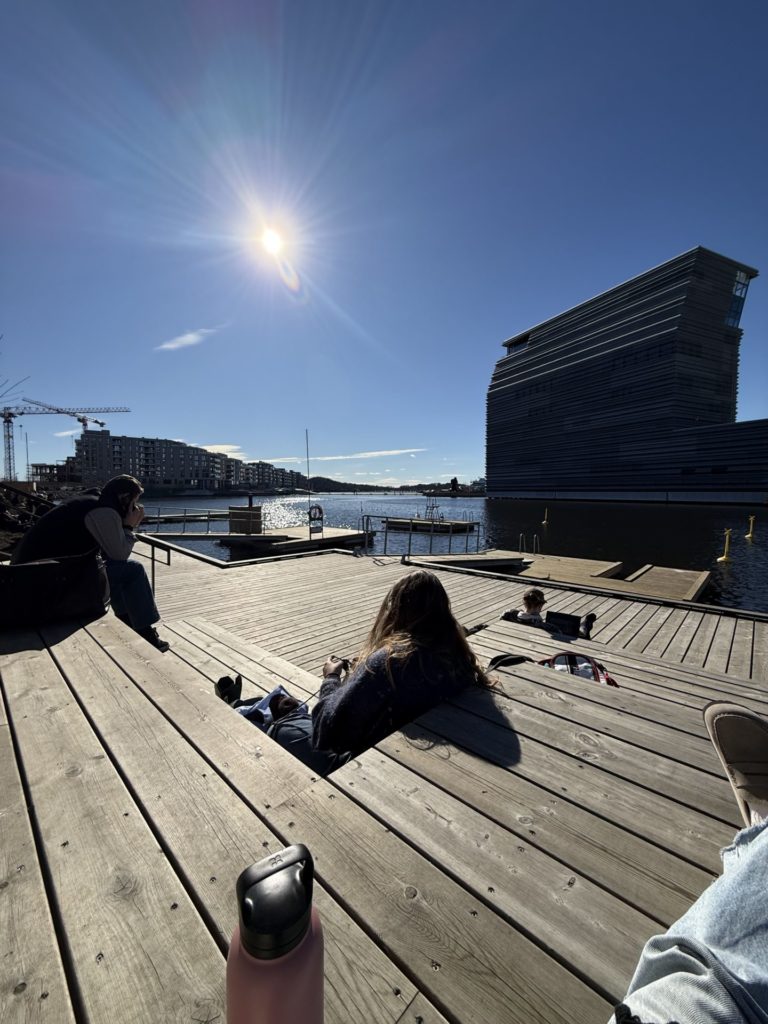 Oslo hat mich auch abseits der Schule schnell beeindruckt. Die Stadt verbindet auf besondere Weise moderne Architektur mit traditionellen nordischen Wohnhäusern und bietet gleichzeitig unmittelbaren Zugang zur Natur. Oft reicht es, an der nächsten U-Bahn-Station auszusteigen, um sich mitten im Grünen wiederzufinden. Bewegung spielt im Alltag generell eine große Rolle. Die Menschen sind bei jedem Wetter draußen unterwegs, sei es beim Joggen, Radfahren oder im Winter beim Langlaufen. Gleichzeitig hat die Stadt ihren eigenen Rhythmus: In Cafés und Museen bleibt es morgens eher ruhig, denn Oslo wacht gefühlt erst gegen 10 oder 11 Uhr richtig auf. Dafür sind die Straßen und Cafés am Nachmittag umso belebter, vor allem, wenn die Sonne scheint. Dann sitzen viele Menschen draußen, genießen die ersten warmen Sonnenstrahlen und lassen den Tag entspannt ausklingen – auch wenn ein Bier hier deutlich teurer ist als in Deutschland. Typische Alltagsrituale wie der Besuch eines Hotdog-Stands oder der „Taco Friday” gehören ebenso dazu und geben einen kleinen Einblick in die norwegische Alltagskultur. Ab Mitte April wird zudem spürbar, wie sich die Stadt auf den Nationalfeiertag vorbereitet, der hier eine große Bedeutung hat.